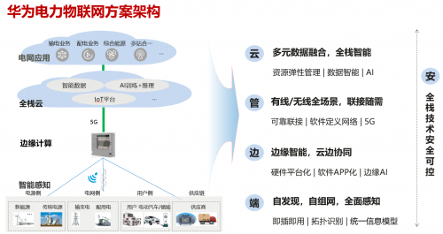 華為構(gòu)建了“云管邊端”的電力物聯(lián)網(wǎng)方案架構(gòu),并且由端到云全棧技術(shù)安全可控?!霸啤庇蒊oT平臺、智能數(shù)據(jù)和AI共同構(gòu)建數(shù)字化底座,并支撐電網(wǎng)業(yè)務(wù)云化應(yīng)用;“管”提供可靠聯(lián)接,有線/無線全場景隨需靈活聯(lián)接;“邊”具備邊緣計(jì)算、云邊協(xié)同和AI能力;“端”全面感知電網(wǎng)信息,支持自描述、自發(fā)現(xiàn)和即插即用。