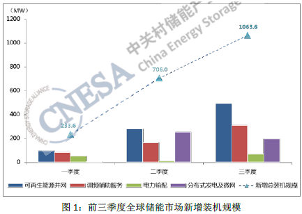 據(jù)中關(guān)村儲(chǔ)能產(chǎn)業(yè)技術(shù)聯(lián)盟(CNESA)項(xiàng)目庫的不完全統(tǒng)計(jì),2016年三季度,全球新增儲(chǔ)能項(xiàng)目(含投運(yùn)、在建、規(guī)劃中項(xiàng)目)54個(gè),裝機(jī)規(guī)模共計(jì)1063.6MW,同比增長780%,環(huán)比今年二季度增長了51%。三季度新增項(xiàng)目主要分布在可再生能源并網(wǎng)和調(diào)頻輔助服務(wù)領(lǐng)域,儲(chǔ)能在這兩個(gè)領(lǐng)域中的裝機(jī)占比分別為46%和29%。