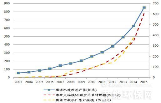 市政大規(guī)模MBR應用和膜法市政水廠規(guī)模變化與膜法水處理行業(yè)產(chǎn)值變化趨勢高度一致