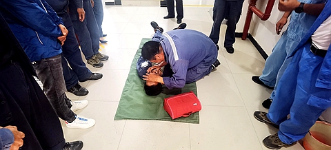 演練模擬大寺鄉(xiāng)發(fā)生6.5級破壞性地震,供電所辦公樓開始搖晃,指揮長嚴(yán)世莊大聲呼喊吹哨,各樓層內(nèi)所有人員立即采取正確的避震措施,迅速抱頭尋找最近的墻角、柱角、堅固高大的桌下、柜旁或開間小的衛(wèi)生間、內(nèi)承重墻墻角蹲下、抱頭、閉眼,抓牢或握實以盡量固定身體,使用安全帽等保護頭部,降低身體重心。隨著指揮長第二次呼喊緊急撤離,各樓層緊急組織人員安全迅速從安全指定安全通道疏散到指定聚集點,過程中員工互相呼喚、提醒避震。撤離后清點發(fā)現(xiàn)1人失蹤,急救組立刻對失蹤人員進行搜救,搜救人員在二樓辦公室發(fā)現(xiàn)失蹤人躺在地上,左手臂被傾倒的辦公桌壓住,造成骨折,同時發(fā)現(xiàn)兩根0.22KV電線(鋁塑線)達在傷員身上,并正通有電源,傷員無意識,心跳呼吸停止同時發(fā)生人員觸電,搜救人員立即斷開有關(guān)電源,用木棒挑開電線,迅速轉(zhuǎn)移傷員至安全地帶后對其進行心肺復(fù)蘇和外傷急救,并撥打120急救電話。經(jīng)全力搶救,傷員已恢復(fù)自主心跳和呼吸,搶救人員對其進行外傷包扎后就地觀察,等待120急救人員到來,同時有人員報告一樓安全工器具室發(fā)生火災(zāi),指揮組迅速組織人員對著火點進行滅火器滅火。
