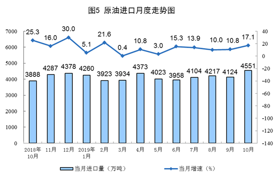 10月份,原油進(jìn)口4551萬(wàn)噸,同比增長(zhǎng)17.1%,增速比上月加快6.3個(gè)百分點(diǎn)。1—10月份,原油進(jìn)口41454.5萬(wàn)噸,同比增長(zhǎng)10.5%。