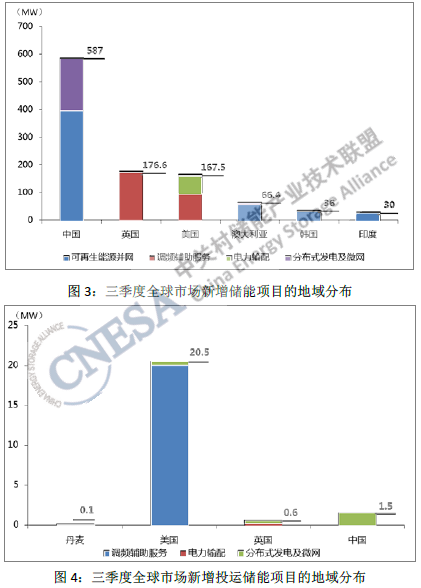 新增投運(yùn)項(xiàng)目中,美國的裝機(jī)規(guī)模最大,為20.5MW,占三季度新增投運(yùn)項(xiàng)目裝機(jī)總規(guī)模的90%,項(xiàng)目幾乎全部應(yīng)用于調(diào)頻輔助服務(wù)領(lǐng)域。