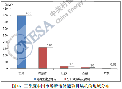 2016年三季度,中國新增投運(yùn)項(xiàng)目3個(gè),裝機(jī)規(guī)模1.5MW,同比增長50%,環(huán)比今年二季度下降了87%。項(xiàng)目全部集中在分布式發(fā)電及微網(wǎng)領(lǐng)域。