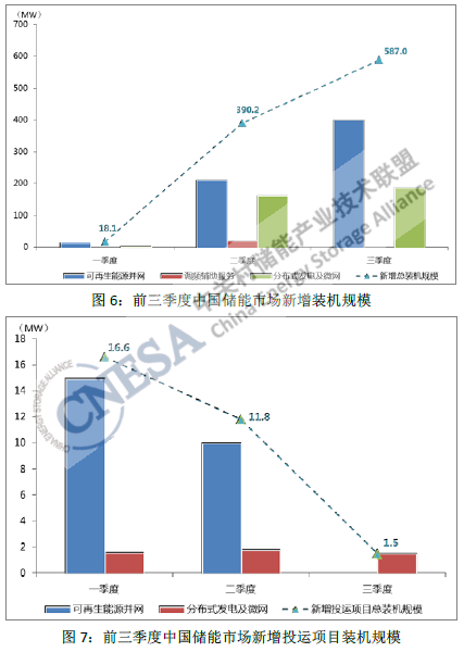 據(jù)中關(guān)村儲(chǔ)能產(chǎn)業(yè)技術(shù)聯(lián)盟(CNESA)項(xiàng)目庫的不完全統(tǒng)計(jì),2016年三季度,中國新增儲(chǔ)能項(xiàng)目(含投運(yùn)、在建、規(guī)劃中項(xiàng)目)14個(gè),裝機(jī)規(guī)模587.0MW,同比增長586%,環(huán)比今年二季度增長了50%。三季度新增項(xiàng)目主要分布在可再生能源并網(wǎng)和分布式發(fā)電及微網(wǎng)領(lǐng)域。