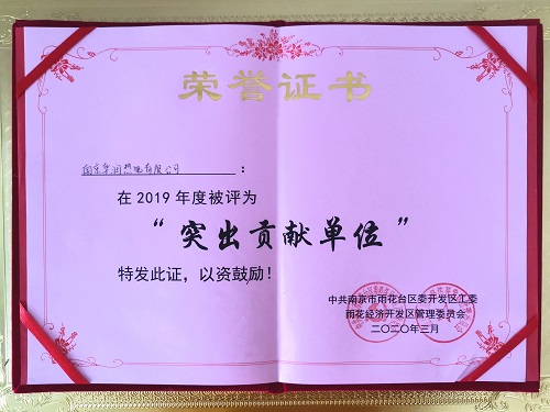 中國電力網(wǎng)訊 4月28日,南京市雨花經(jīng)濟(jì)開發(fā)區(qū)管委會婁杰書記一行四人,蒞臨南京華潤熱電有限公司并向公司授予雨花經(jīng)濟(jì)開發(fā)區(qū)2019年度“突出貢獻(xiàn)單位”獎(jiǎng)牌和證書,對公司2019年在開發(fā)區(qū)社會、經(jīng)濟(jì)發(fā)展等工作中做出的突出表現(xiàn)進(jìn)行表彰。總經(jīng)理丁建民代表公司領(lǐng)取了獎(jiǎng)牌。