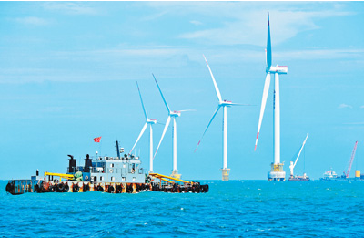 5月21日,在福建莆田平海灣海上風(fēng)電場項目施工現(xiàn)場,一根直徑6.7米的嵌巖單樁成功植入海底。