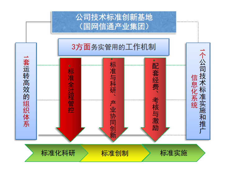 該創(chuàng)新基地基于2019籌建工作基礎(chǔ),進(jìn)一步健全了“1+3+1”組織體系和工作機(jī)制(即:以搭建一套運(yùn)轉(zhuǎn)高效的組織體系為核心,以構(gòu)設(shè)“標(biāo)準(zhǔn)全過程管控,標(biāo)準(zhǔn)與科研、產(chǎn)業(yè)協(xié)同創(chuàng)新,配套經(jīng)費(fèi)、考核與激勵(lì)”三方面務(wù)實(shí)管用的工作機(jī)制為抓手,以建設(shè)完善一個(gè)公司技術(shù)標(biāo)準(zhǔn)實(shí)施和推廣信息化系統(tǒng)為依托,統(tǒng)籌推進(jìn)創(chuàng)新基地各項(xiàng)任務(wù))。完善“標(biāo)準(zhǔn)全過程管控,標(biāo)準(zhǔn)與科研、產(chǎn)業(yè)協(xié)同創(chuàng)新,配套經(jīng)費(fèi)、考核與激勵(lì)”三方面工作機(jī)制。搭建了國家電網(wǎng)公司技術(shù)標(biāo)準(zhǔn)體系本地?cái)?shù)據(jù)庫和技術(shù)標(biāo)準(zhǔn)實(shí)施評(píng)價(jià)信息化平臺(tái),完成公司制度標(biāo)準(zhǔn)智能管理平臺(tái)建設(shè),構(gòu)建了首個(gè)電力行業(yè)標(biāo)準(zhǔn)與制度知識(shí)圖譜庫,初步形成“電網(wǎng)全業(yè)務(wù)神經(jīng)網(wǎng)絡(luò)”