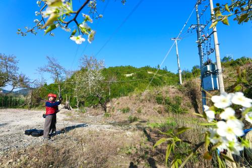 在這如詩如畫的梨山花海中,頭戴安全帽,身著國網(wǎng)福建電力“雙滿意”(壽寧閩東之光)共產(chǎn)黨員服務隊“紅馬甲”的身影格外引人注目,他們手持紅外測溫儀,穿梭在雪白的梨花的小徑上,成為一道獨特的風景。巡視過程中,他們仔細地對10kV浦南線進行檢查,每一個接頭、每一臺變壓器,都是他們關(guān)注的重點。與此同時,無人機也在梨山上空盤旋,從高空視角對線路進行全方位巡查。通過無人機搭載的高清攝像頭,工作人員可以清晰地看到線路是否存在安全隱患,大大提高了巡檢效率和準確性。