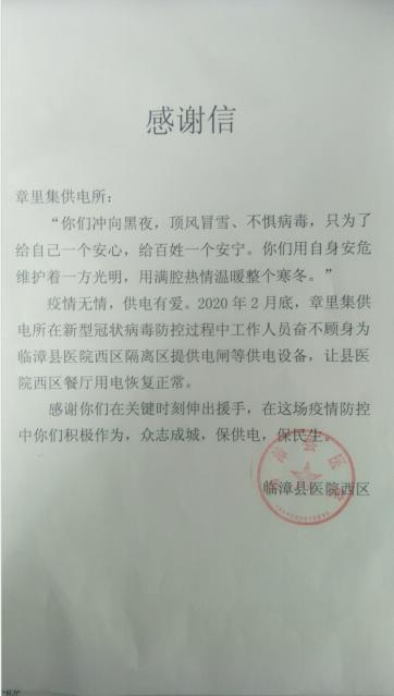 章里集供電所所長吳超接過重量雖輕卻又意義非凡的感謝信后激動地說:“謝謝你們對我們工作的肯定,疫情戰(zhàn)場上,是你們白衣天使沖鋒在前。作為國家電網(wǎng)人,我們更要發(fā)揚頂?shù)蒙?、靠得住、打得贏得電力鐵軍精神,攜手打贏這場沒有硝煙的戰(zhàn)疫!”