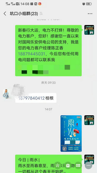 隨著智能通信時(shí)代的來(lái)臨,微信這一網(wǎng)絡(luò)軟件已成為人們重要的日常交流工具,通過微信群和客戶溝通交流,既省時(shí)省力,又方便快捷,有效地拉近了雙方的距離。為了更好地開展供電服務(wù)工作,樂安縣公司臺(tái)區(qū)客戶經(jīng)理早前就已經(jīng)自建或主動(dòng)加入管理區(qū)域的村委、社區(qū)微信群,隨時(shí)將停電信息、線路搶修、電費(fèi)回收、節(jié)約和安全用電知識(shí)等信息在群中公告和提醒。同時(shí),客戶也可以通過微信群@客戶經(jīng)理,咨詢用電服務(wù)、了解供電信息、反映用電問題,在第一時(shí)間獲得供電服務(wù)。