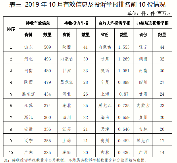 各?。ㄗ灾螀^(qū)、直轄市)按照收到的有效信息數(shù)量排序,山東、河北、河南、陜西、黑龍江等列全國(guó)前10位;按照投訴舉報(bào)數(shù)量排序,陜西、內(nèi)蒙古、甘肅、黑龍江、河北等排在全國(guó)前10位;按照百萬(wàn)人均投訴舉報(bào)數(shù)量排序,內(nèi)蒙古、甘肅、陜西、寧夏、上海等排在全國(guó)前10位;按照辦結(jié)屬實(shí)投訴舉報(bào)數(shù)量排序,遼寧、湖南、河南、四川、甘肅等排在全國(guó)前10位。(2019年10月有效信息及投訴舉報(bào)排名前10位情況見表三)