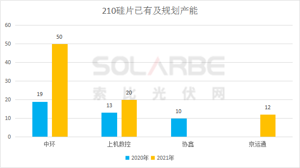 2021年中環(huán)G12硅片產能將從19GW提升至50GW,目前中環(huán)210產品規(guī)模化生產良率已超95%,一月份中環(huán)210硅片出貨將超1.4GW,市占率高達99.5%。2020年11月4日,京運通宣布投資70 億元在樂山建設24GW單晶項目,適配210mm硅片生產線,一期12GW計劃于2020年第四季度開工建設。