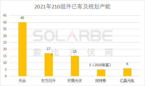 組件端,天合、東方日升、環(huán)晟光伏、阿特斯四家企業(yè)2021年的210組件產能規(guī)劃超83GW。天合在浙江義烏、宿遷、江蘇鹽城建設了三大210超級工廠,2020年底天合210組件產能已超22GW,2021年在全球產能將超過50GW,其中210產能占比超過80%,在40GW以上。