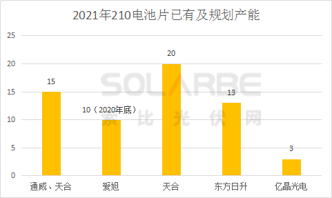 電池片端,通威、天合、愛旭、東方日升四家企業(yè)2021年的210電池片產能規(guī)劃超61GW。