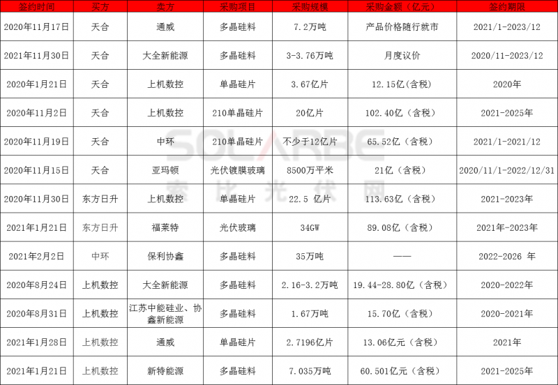 為保證210產品正常供應,天合、東方日升、中環(huán)紛紛簽訂多晶硅料、硅片以及光伏玻璃長單。