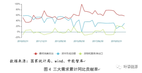 同時(shí),從消費(fèi)、投資和國外三大需求累計(jì)同比對GDP貢獻(xiàn)率看,消費(fèi)對經(jīng)濟(jì)增長的貢獻(xiàn)率逐步成為中流砥柱,而投資形成貢獻(xiàn)率趨于穩(wěn)定。