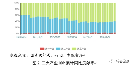 分產(chǎn)業(yè)看,10余年來,隨著我國經(jīng)濟(jì)結(jié)構(gòu)的轉(zhuǎn)型,三大產(chǎn)業(yè)對GDP的貢獻(xiàn)率發(fā)生明顯變化。2010至2019年,第三產(chǎn)業(yè)GDP貢獻(xiàn)率由39.7%上升至59.4%,增加接近20個(gè)百分點(diǎn);第二產(chǎn)業(yè)GDP貢獻(xiàn)率由58.6%降至36.8%,下降21.8個(gè)百分點(diǎn)。三大產(chǎn)業(yè)貢獻(xiàn)率格局基本穩(wěn)定,第三產(chǎn)業(yè)成為拉動(dòng)GDP的生力軍,其占比上升5.7個(gè)百分點(diǎn);二產(chǎn)占比下降6.6個(gè)百分點(diǎn)。2019年,第三產(chǎn)業(yè)和城鄉(xiāng)居民生活用電量對全社會(huì)用電量增長的貢獻(xiàn)率達(dá)51.0%,比上年提高11.1個(gè)百分點(diǎn),其中第三產(chǎn)業(yè)貢獻(xiàn)率比上年提高10.1個(gè)百分點(diǎn),是支撐全社會(huì)用電量增長的主要?jiǎng)恿Α?/p>