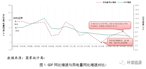用電量與GDP增速具有較強(qiáng)的相關(guān)性。從GDP與用電量增速對比曲線圖可以看出,2003-2019年二者用電量走勢基本一致。2015年和2018年二者有些背離,一方面是經(jīng)濟(jì)增速進(jìn)入換擋期,動(dòng)力轉(zhuǎn)換;另一方面是二者統(tǒng)計(jì)指標(biāo)調(diào)整時(shí)間上有些不一致。