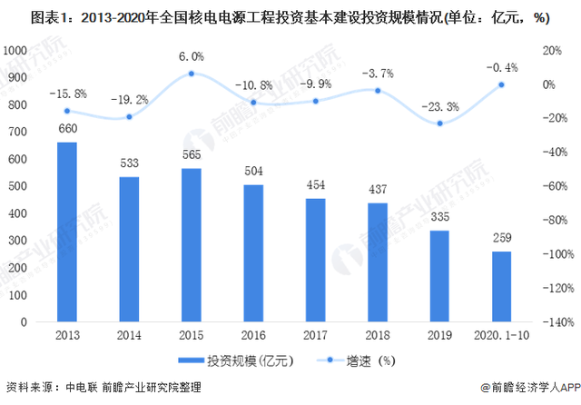 受到福島核電站等事故的影響,我國核電建設(shè)雖然處在高速發(fā)展期,但是保持著以“穩(wěn)”為主的基調(diào),新開工機(jī)組數(shù)量較少,核電工程投資額有所下滑。根據(jù)中國電力企業(yè)聯(lián)合會(huì)的統(tǒng)計(jì)數(shù)據(jù)顯示,2020年1-10月,全國主要核電企業(yè)電源工程完成投資259億元,同比下降0.4%。