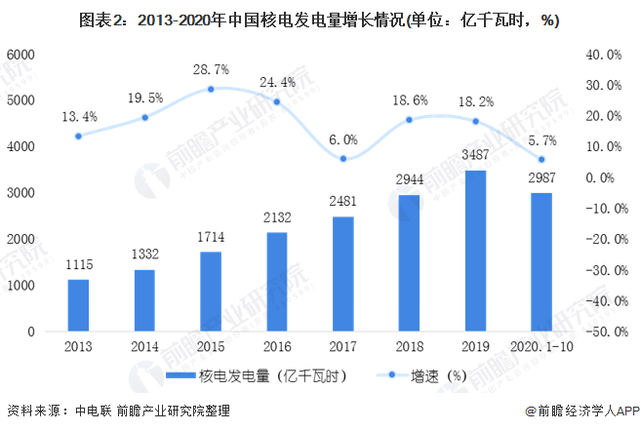雖然近年來受國家核電批復(fù)減少以及新建投資額的降低的影響,我國核電主要企業(yè)電源項(xiàng)目在建規(guī)模有所縮小,但是隨著項(xiàng)目的完工,我國核電裝機(jī)規(guī)模不斷擴(kuò)大,發(fā)電量同步提高。根據(jù)中國電力企業(yè)聯(lián)合會(huì)的數(shù)據(jù)顯示,2020年1-10月,全國核電發(fā)電量2987億千瓦時(shí),同比增長5.7%,增速比上年同期回落13.6個(gè)百分點(diǎn)。