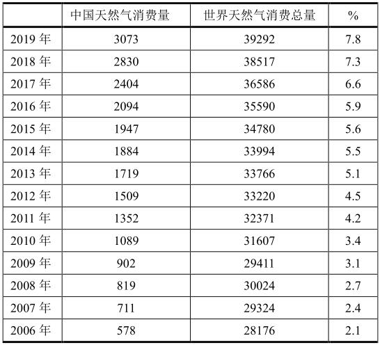 中國天然氣消費占世界消費總量的比例(單位:億立方米)